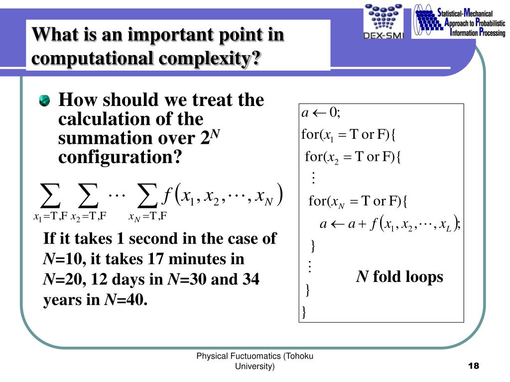 What is an important point in computational complexity? • How should we treat the calculation of the summation over 2N configuration? If it takes 1 second in the case of N=10, it takes 17 minutes in N=20, 12 days in N=30 and 34 years in N=40. N fold loops Physical Fuctuomatics (Tohoku University)