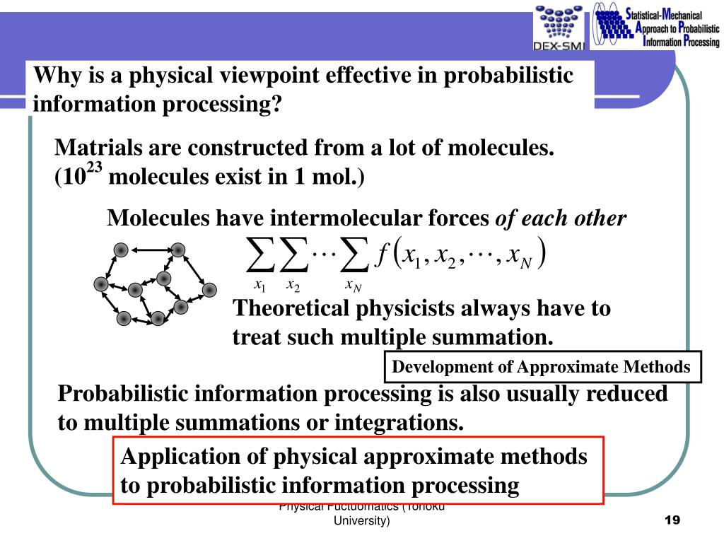 Why is a physical viewpoint effective in probabilistic information processing? Matrials are constructed from a lot of molecules. (1023 molecules exist in 1 mol.) Molecules have intermolecular forces of each other Theoretical physicists always have to treat such multiple summation. Development of Approximate Methods Probabilistic information processing is also usually reduced to multiple summations or integrations. Application of physical approximate methods to probabilistic information processing Physical Fuctuomatics (Tohoku University)