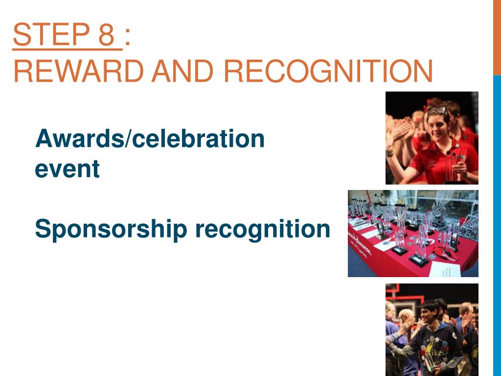 SteP 8 : Reward and Recognition • Awards/celebration event • Sponsorship recognition