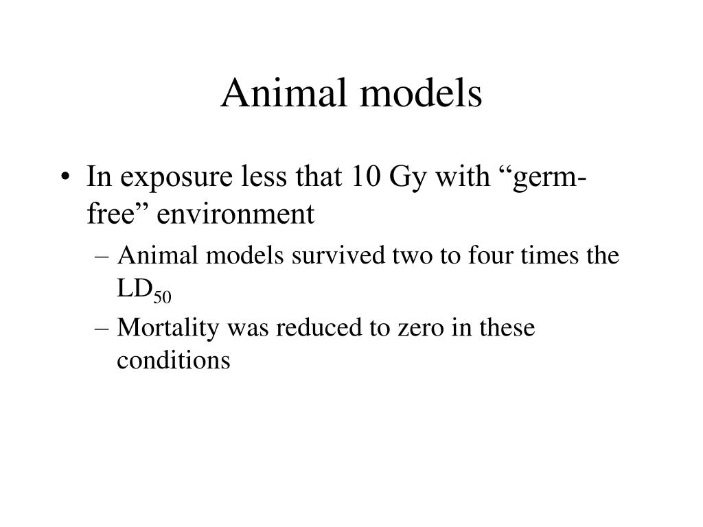 Animal models • In exposure less that 10 Gy with “germ-free” environment • Animal models survived two to four times the LD50 • Mortality was reduced to zero in these conditions