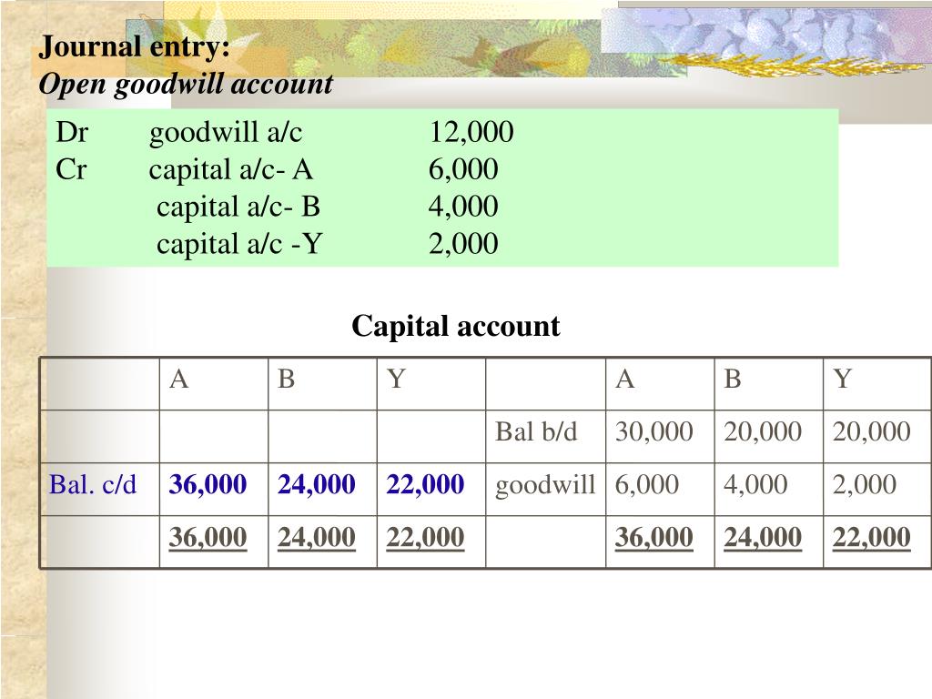 Dr goodwill a/c 12,000 Cr capital a/c- A 6,000 capital a/c- B 4,000 capital a/c -Y 2,000 A B Y A B Y Bal b/d 30,000 20,000 20,000 Bal. c/d 36,000 24,000 22,000 goodwill 6,000 4,000 2,000 36,000 24,000 22,000 36,000 24,000 22,000 Journal entry: Open goodwill account Capital account