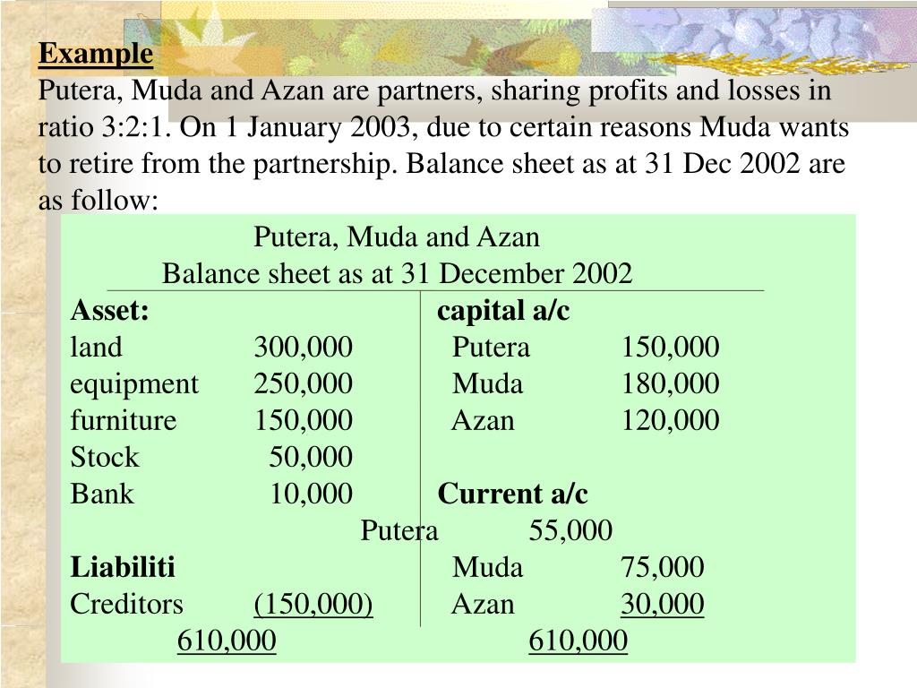 Putera, Muda and Azan Balance sheet as at 31 December 2002 Asset:capital a/c land 300,000 Putera 150,000 equipment 250,000 Muda 180,000 furniture 150,000 Azan 120,000 Stock 50,000 Bank 10,000 Current a/c Putera 55,000 Liabiliti Muda 75,000 Creditors (150,000) Azan 30,000 610,000610,000 Example Putera, Muda and Azan are partners, sharing profits and losses in ratio 3:2:1. On 1 January 2003, due to certain reasons Muda wants to retire from the partnership. Balance sheet as at 31 Dec 2002 are as follow: