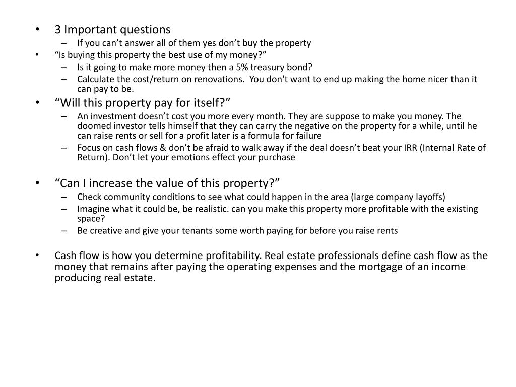 3 Important questions • If you can’t answer all of them yes don’t buy the property • “Is buying this property the best use of my money?” • Is it going to make more money then a 5% treasury bond? • Calculate the cost/return on renovations. You don't want to end up making the home nicer than it can pay to be. • “Will this property pay for itself?” • An investment doesn’t cost you more every month. They are suppose to make you money. The doomed investor tells himself that they can carry the negative on the property for a while, until he can raise rents or sell for a profit later is a formula for failure • Focus on cash flows & don’t be afraid to walk away if the deal doesn’t beat your IRR (Internal Rate of Return). Don’t let your emotions effect your purchase • “Can I increase the value of this property?” • Check community conditions to see what could happen in the area (large company layoffs) • Imagine what it could be, be realistic. can you make this property more profitable with the existing space? • Be creative and give your tenants some worth paying for before you raise rents • Cash flow is how you determine profitability. Real estate professionals define cash flow as the money that remains after paying the operating expenses and the mortgage of an income producing real estate.