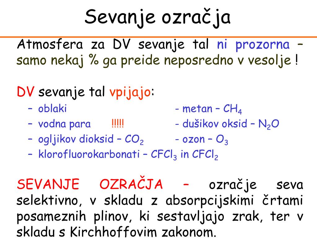 Sevanje ozračja Atmosfera za DV sevanje tal ni prozorna – samo nekaj % ga preide neposredno v vesolje ! DV sevanje tal vpijajo: • oblaki - metan – CH4 • vodna para !!!!! - dušikov oksid – N2O • ogljikov dioksid – CO2 - ozon – O3 • klorofluorokarbonati – CFCl3 in CFCl2 SEVANJE OZRAČJA – ozračje seva selektivno, v skladu z absorpcijskimi črtami posameznih plinov, ki sestavljajo zrak, ter v skladu s Kirchhoffovim zakonom.