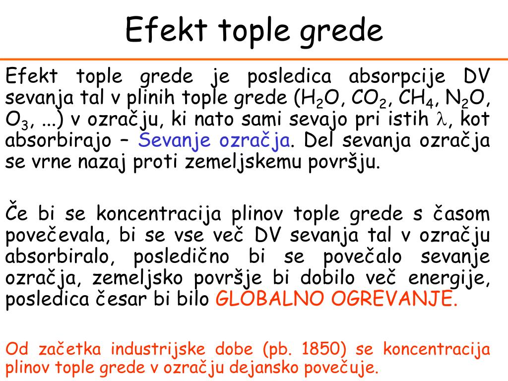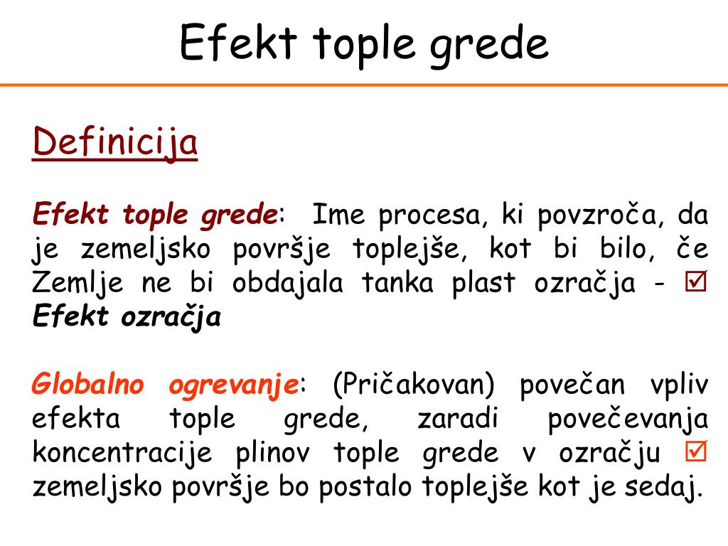 Efekt tople grede Definicija Efekt tople grede: Ime procesa, ki povzroča, da je zemeljsko površje toplejše, kot bi bilo, če Zemlje ne bi obdajala tanka plast ozračja - Efekt ozračja Globalno ogrevanje: (Pričakovan) povečan vpliv efekta tople grede, zaradi povečevanja koncentracije plinov tople grede v ozračju zemeljsko površje bo postalo toplejše kot je sedaj.