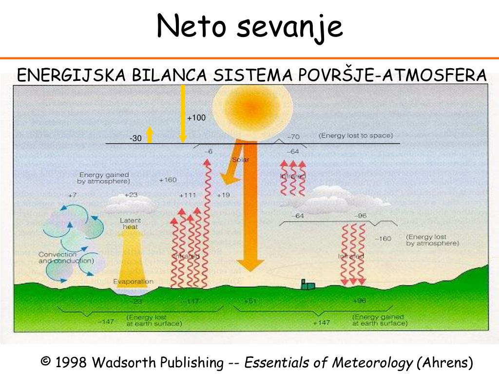 Neto sevanje ENERGIJSKA BILANCA SISTEMA POVRŠJE-ATMOSFERA +100 -30 © 1998 Wadsorth Publishing -- Essentials of Meteorology (Ahrens)