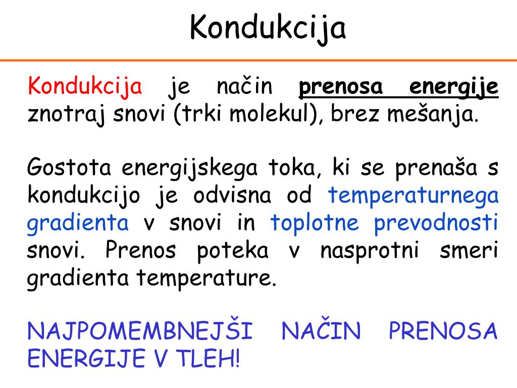 Kondukcija Kondukcija je način prenosa energije znotraj snovi (trki molekul), brez mešanja. Gostota energijskega toka, ki se prenaša s kondukcijo je odvisna od temperaturnega gradienta v snovi in toplotne prevodnosti snovi. Prenos poteka v nasprotni smeri gradienta temperature. NAJPOMEMBNEJŠI NAČIN PRENOSA ENERGIJE V TLEH!