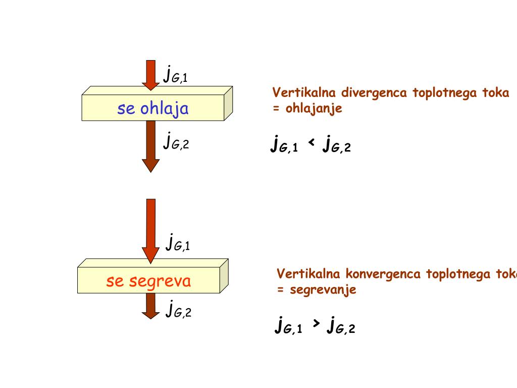 jG,1 Vertikalna divergenca toplotnega toka = ohlajanje jG,1 < jG,2 se ohlaja jG,2 jG,1 se segreva Vertikalna konvergenca toplotnega toka = segrevanje jG,1 > jG,2 jG,2