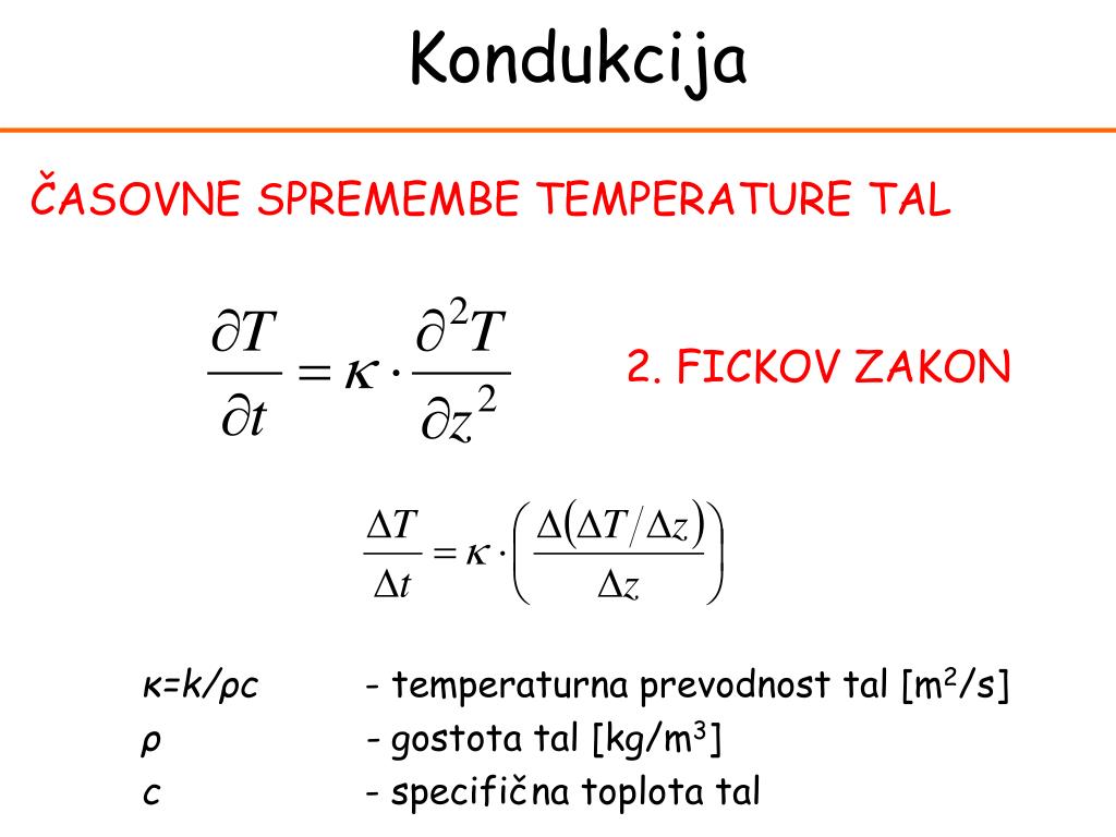 Kondukcija ČASOVNE SPREMEMBE TEMPERATURE TAL 2. FICKOV ZAKON κ=k/ρc- temperaturna prevodnost tal[m2/s] ρ - gostota tal[kg/m3] c - specifična toplota tal