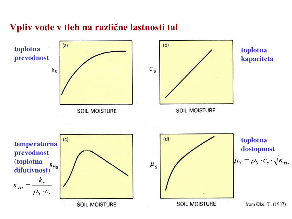 Vpliv vode v tleh na različne lastnosti tal toplotna prevodnost toplotna kapaciteta toplotna dostopnost temperaturna prevodnost (toplotna difutivnost) from Oke, T., (1987)