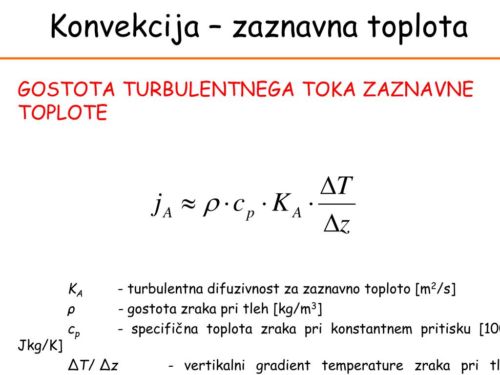 Convection Konvekcija – zaznavna toplota GOSTOTA TURBULENTNEGA TOKA ZAZNAVNE TOPLOTE KA - turbulentna difuzivnost za zaznavno toploto [m2/s] ρ - gostota zraka pri tleh [kg/m3] cp - specifična toplota zraka pri konstantnem pritisku [1004 Jkg/K] ΔT/Δz - vertikalni gradient temperature zraka pri tleh [K/m]