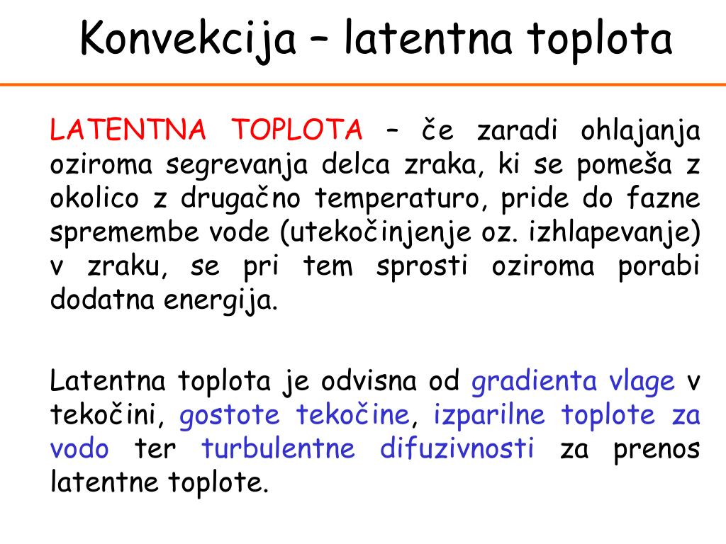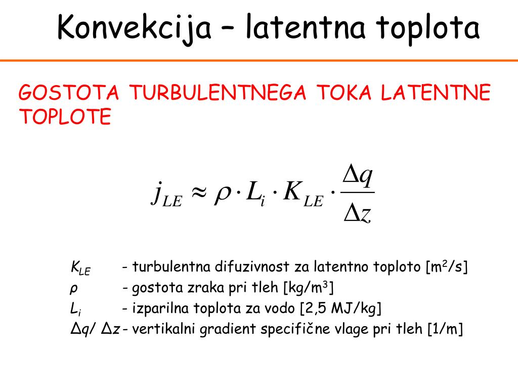 Convection Konvekcija – latentna toplota LATENTNA TOPLOTA – če zaradi ohlajanja oziroma segrevanja delca zraka, ki se pomeša z okolico z drugačno temperaturo, pride do fazne spremembe vode (utekočinjenje oz. izhlapevanje) v zraku, se pri tem sprosti oziroma porabi dodatna energija. Latentna toplota je odvisna od gradienta vlagev tekočini, gostote tekočine, izparilne toplote za vodo ter turbulentne difuzivnosti za prenos latentne toplote.