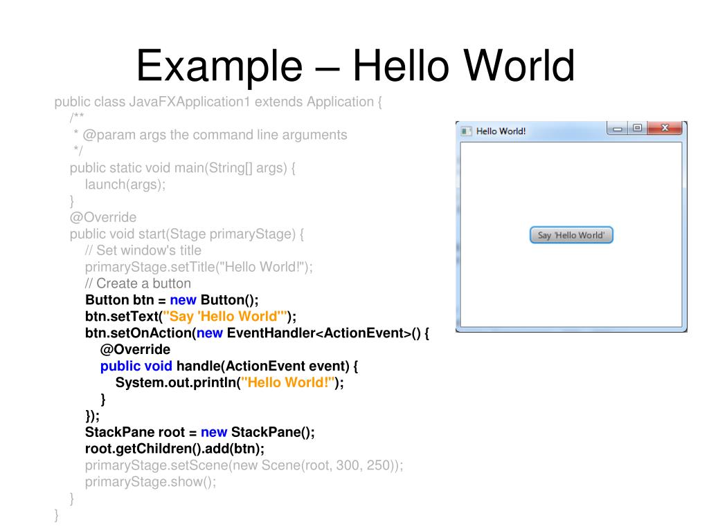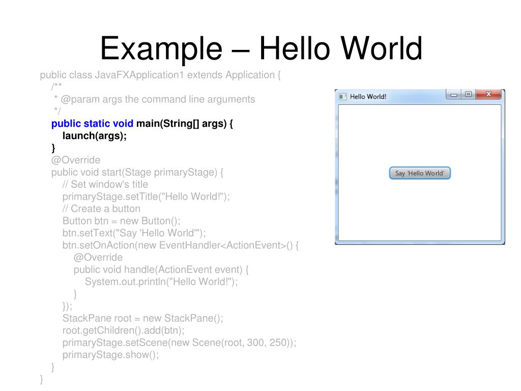 Example – Hello World public class JavaFXApplication1 extends Application { /** * @param args the command line arguments */ public static void main(String[] args) { launch(args); } @Override public void start(Stage primaryStage) { // Set window's title primaryStage.setTitle("Hello World!"); // Create a button Button btn = new Button(); btn.setText("Say 'Hello World'"); btn.setOnAction(new EventHandler<ActionEvent>() { @Override public void handle(ActionEvent event) { System.out.println("Hello World!"); } }); StackPane root = new StackPane(); root.getChildren().add(btn); primaryStage.setScene(new Scene(root, 300, 250)); primaryStage.show(); } }