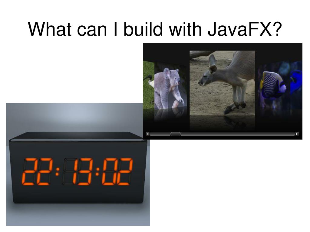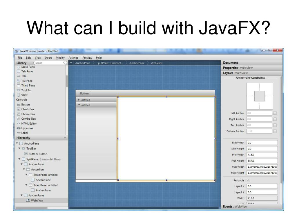 What’s new in JavaFX 2.0? • New graphics and media engine • FXML • Web component • Wide variety of built-in UI controls • Refreshed browser plug-In
