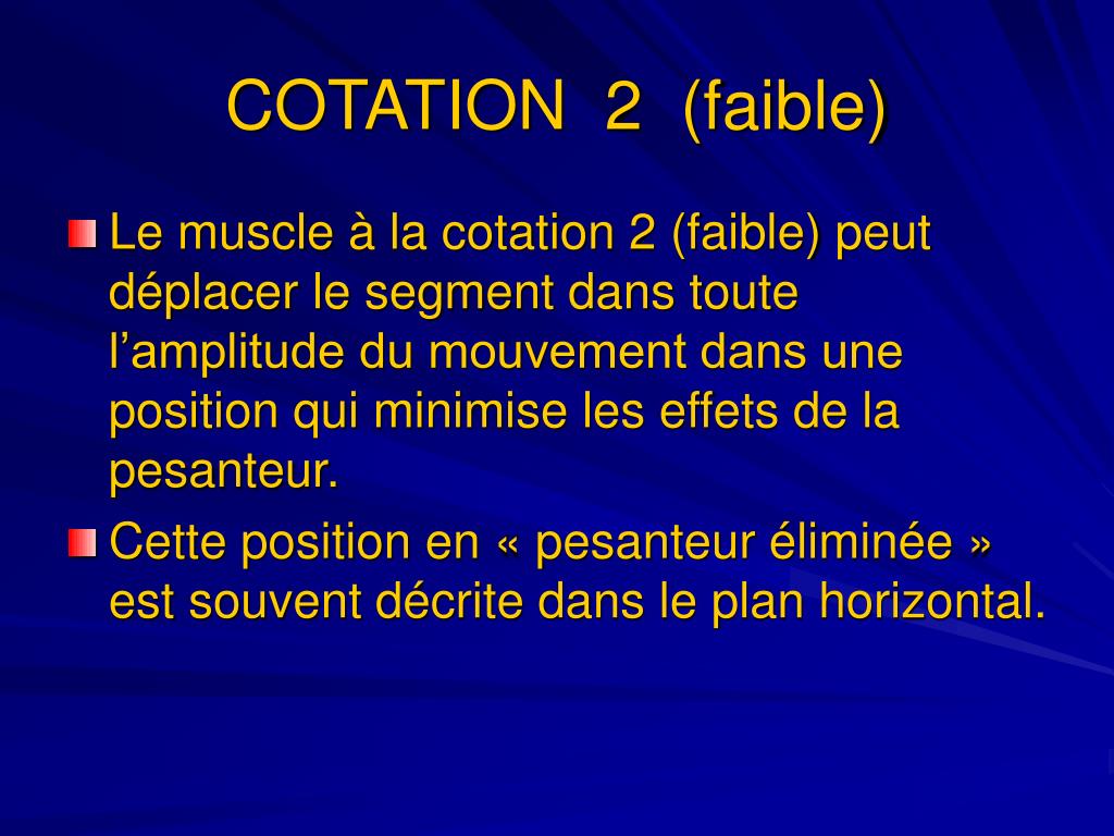 COTATION 2 (faible) • Le muscle à la cotation 2 (faible) peut déplacer le segment dans toute l’amplitude du mouvement dans une position qui minimise les effets de la pesanteur. • Cette position en « pesanteur éliminée » est souvent décrite dans le plan horizontal.