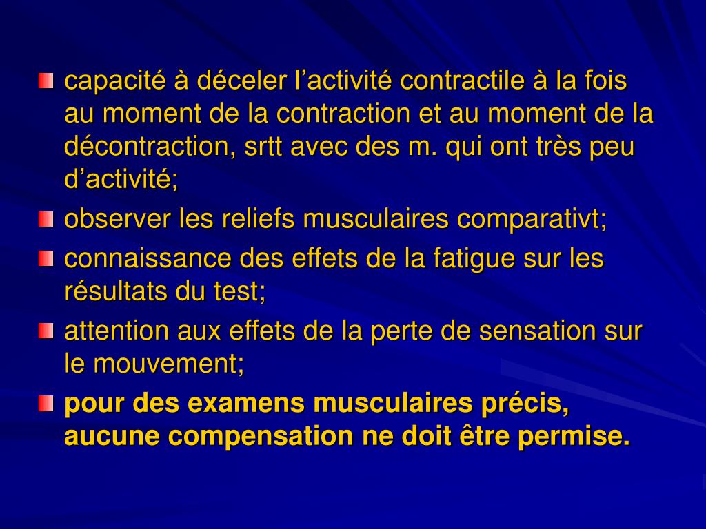 capacité à déceler l’activité contractile à la fois au moment de la contraction et au moment de la décontraction, srtt avec des m. qui ont très peu d’activité; • observer les reliefs musculaires comparativt; • connaissance des effets de la fatigue sur les résultats du test; • attention aux effets de la perte de sensation sur le mouvement; • pour des examens musculaires précis, aucune compensation ne doit être permise.