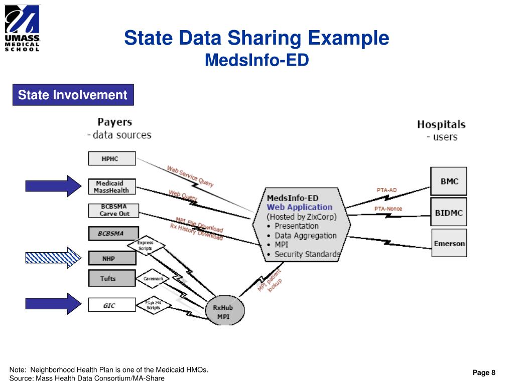 State Data Sharing ExampleMedsInfo-ED State Involvement Note: Neighborhood Health Plan is one of the Medicaid HMOs. Source: Mass Health Data Consortium/MA-Share