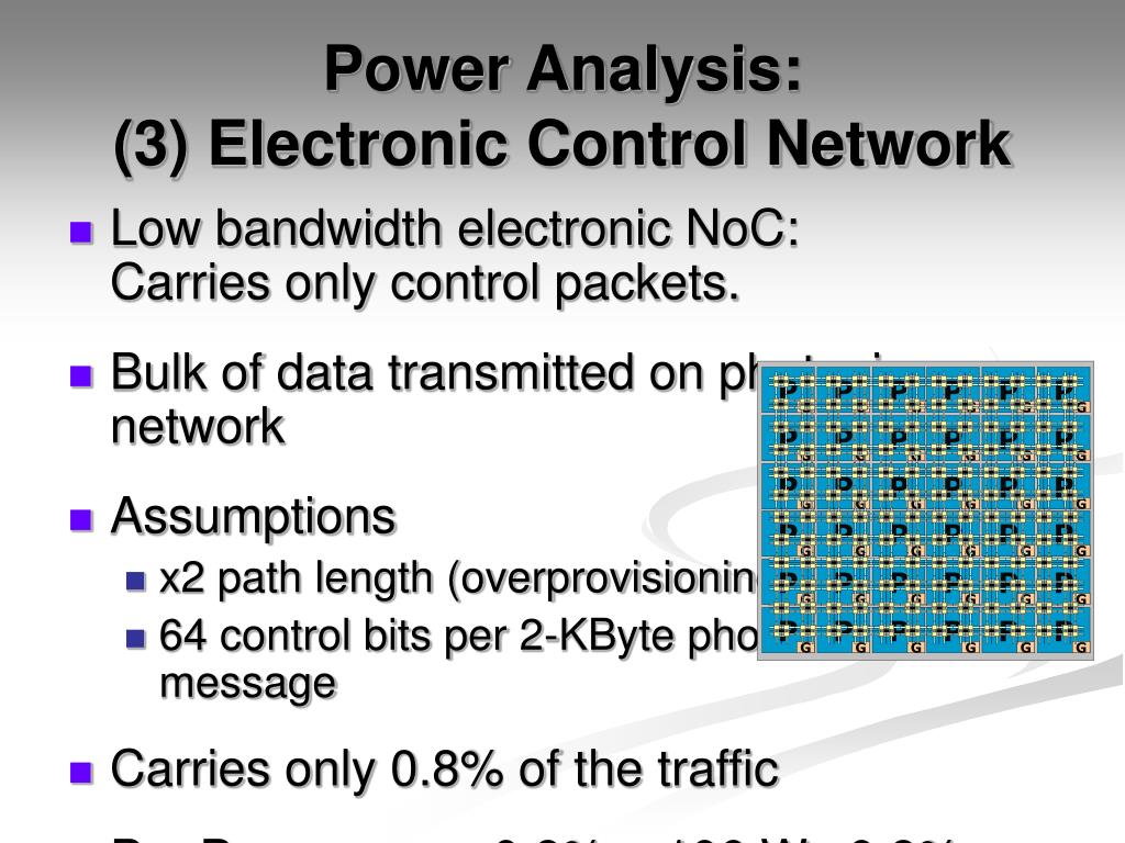 P P P P P P P P P P P P G G G G G G G G G G G G P P P P P P P P P P P P G G G G G G G G G G G G P P P P P P P P P P P P G G G G G G G G G G G G Power Analysis:(3) Electronic Control Network • Low bandwidth electronic NoC:Carries only control packets. • Bulk of data transmitted on photonic network • Assumptions • x2 path length (overprovisioning) • 64 control bits per 2-KByte photonicmessage • Carries only 0.8% of the traffic • P = PElectronic-NoC 0.8% = 106 W 0.8% • Electronic control layer 0.82 W • Will scale down with electronic technology