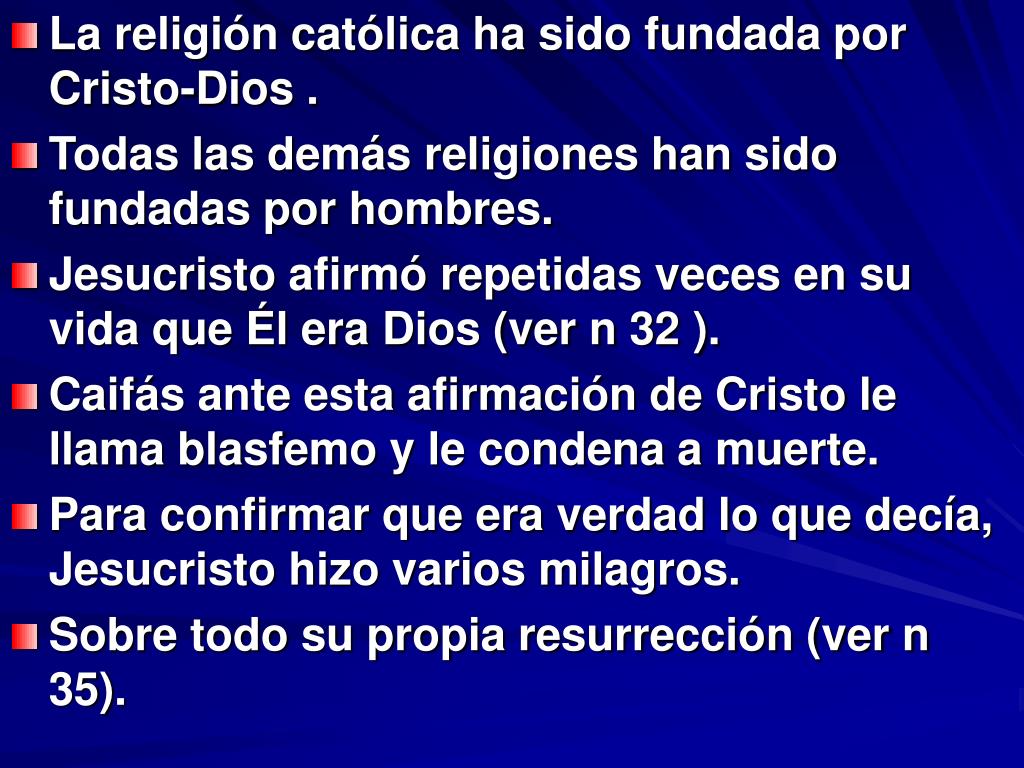 La religión católica ha sido fundada por Cristo-Dios . • Todas las demás religiones han sido fundadas por hombres. • Jesucristo afirmó repetidas veces en su vida que Él era Dios (ver n 32 ). • Caifás ante esta afirmación de Cristo le llama blasfemo y le condena a muerte. • Para confirmar que era verdad lo que decía, Jesucristo hizo varios milagros. • Sobre todo su propia resurrección (ver n 35).