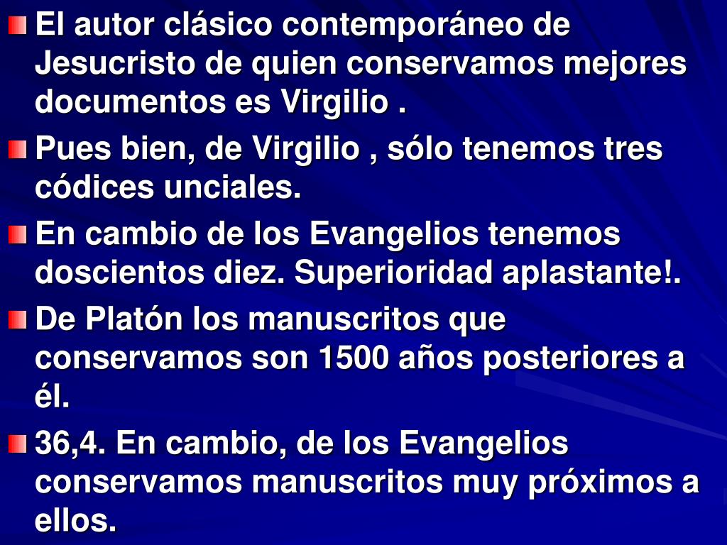 El autor clásico contemporáneo de Jesucristo de quien conservamos mejores documentos es Virgilio . • Pues bien, de Virgilio , sólo tenemos tres códices unciales. • En cambio de los Evangelios tenemos doscientos diez. Superioridad aplastante!. • De Platón los manuscritos que conservamos son 1500 años posteriores a él. • 36,4. En cambio, de los Evangelios conservamos manuscritos muy próximos a ellos.