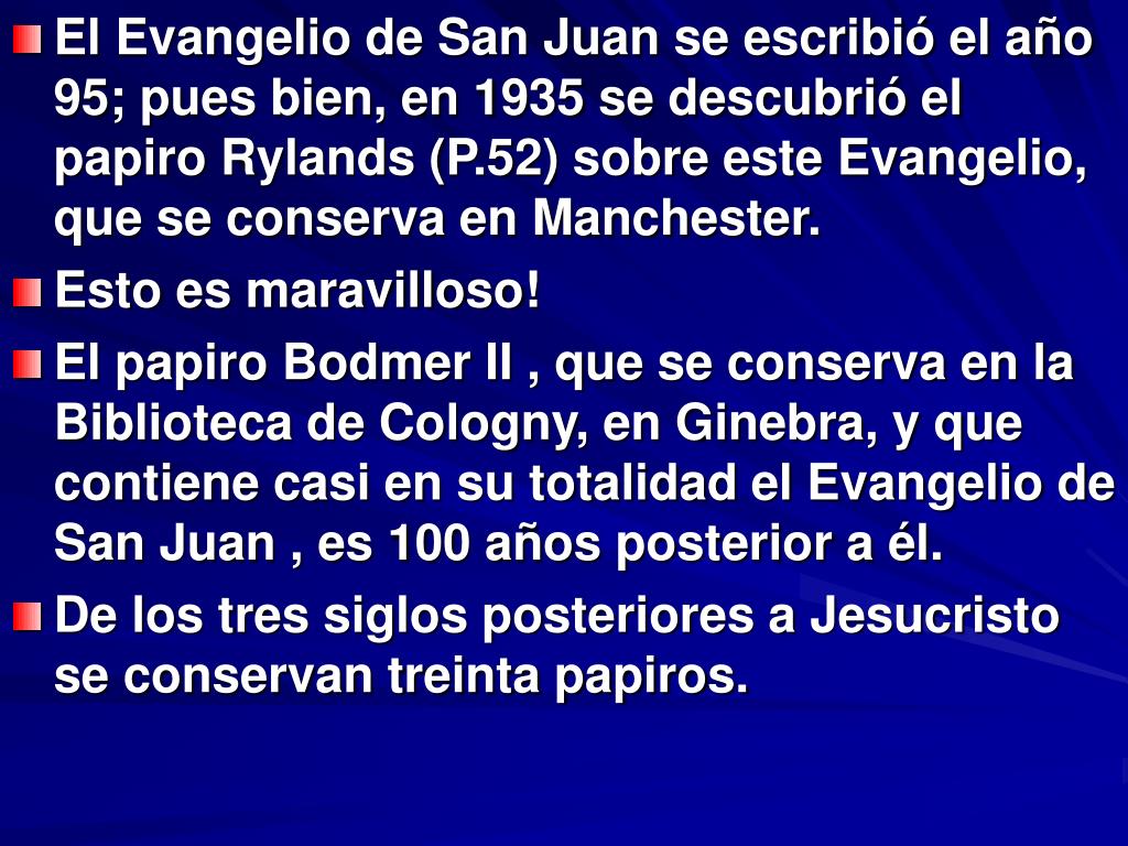El Evangelio de San Juan se escribió el año 95; pues bien, en 1935 se descubrió el papiro Rylands (P.52) sobre este Evangelio, que se conserva en Manchester. • Esto es maravilloso! • El papiro Bodmer II , que se conserva en la Biblioteca de Cologny, en Ginebra, y que contiene casi en su totalidad el Evangelio de San Juan , es 100 años posterior a él. • De los tres siglos posteriores a Jesucristo se conservan treinta papiros.