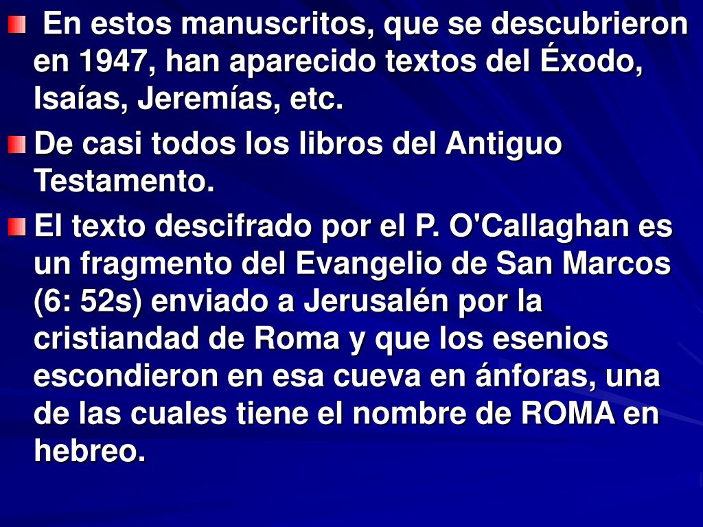 En estos manuscritos, que se descubrieron en 1947, han aparecido textos del Éxodo, Isaías, Jeremías, etc. • De casi todos los libros del Antiguo Testamento. • El texto descifrado por el P. O'Callaghan es un fragmento del Evangelio de San Marcos (6: 52s) enviado a Jerusalén por la cristiandad de Roma y que los esenios escondieron en esa cueva en ánforas, una de las cuales tiene el nombre de ROMA en hebreo.
