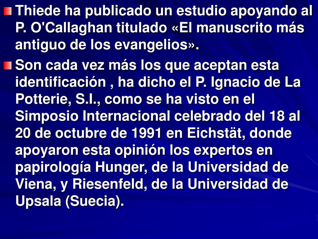 Thiede ha publicado un estudio apoyando al P. O'Callaghan titulado «El manuscrito más antiguo de los evangelios». • Son cada vez más los que aceptan esta identificación , ha dicho el P. Ignacio de La Potterie, S.I., como se ha visto en el Simposio Internacional celebrado del 18 al 20 de octubre de 1991 en Eichstät, donde apoyaron esta opinión los expertos en papirología Hunger, de la Universidad de Viena, y Riesenfeld, de la Universidad de Upsala (Suecia).