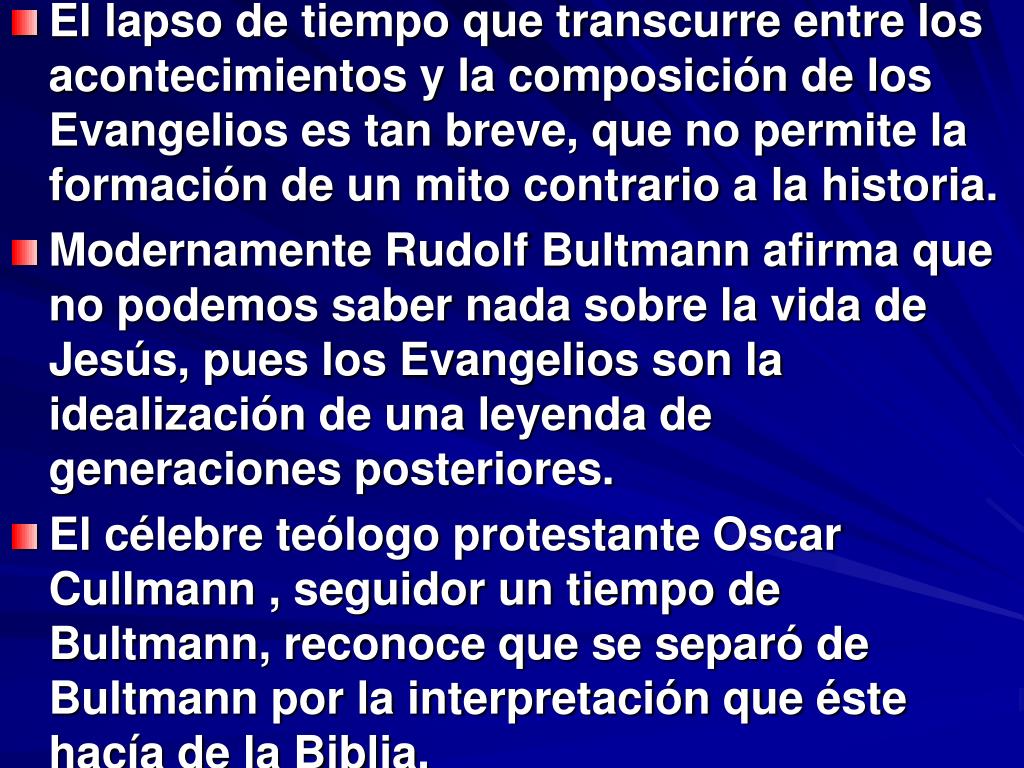 El lapso de tiempo que transcurre entre los acontecimientos y la composición de los Evangelios es tan breve, que no permite la formación de un mito contrario a la historia. • Modernamente Rudolf Bultmann afirma que no podemos saber nada sobre la vida de Jesús, pues los Evangelios son la idealización de una leyenda de generaciones posteriores. • El célebre teólogo protestante Oscar Cullmann , seguidor un tiempo de Bultmann, reconoce que se separó de Bultmann por la interpretación que éste hacía de la Biblia.