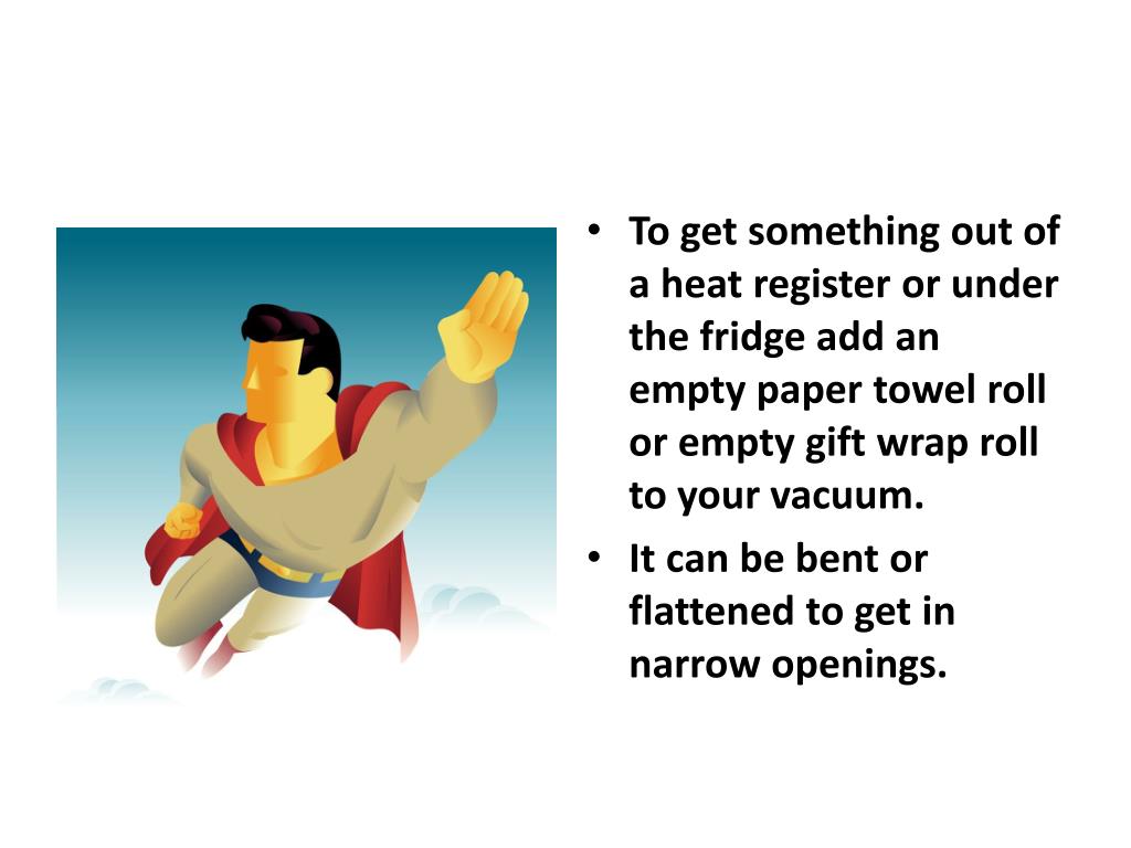 To get something out of a heat register or under the fridge add an empty paper towelroll or empty gift wrap roll to your vacuum. • It can be bent or flattened to get in narrow openings.