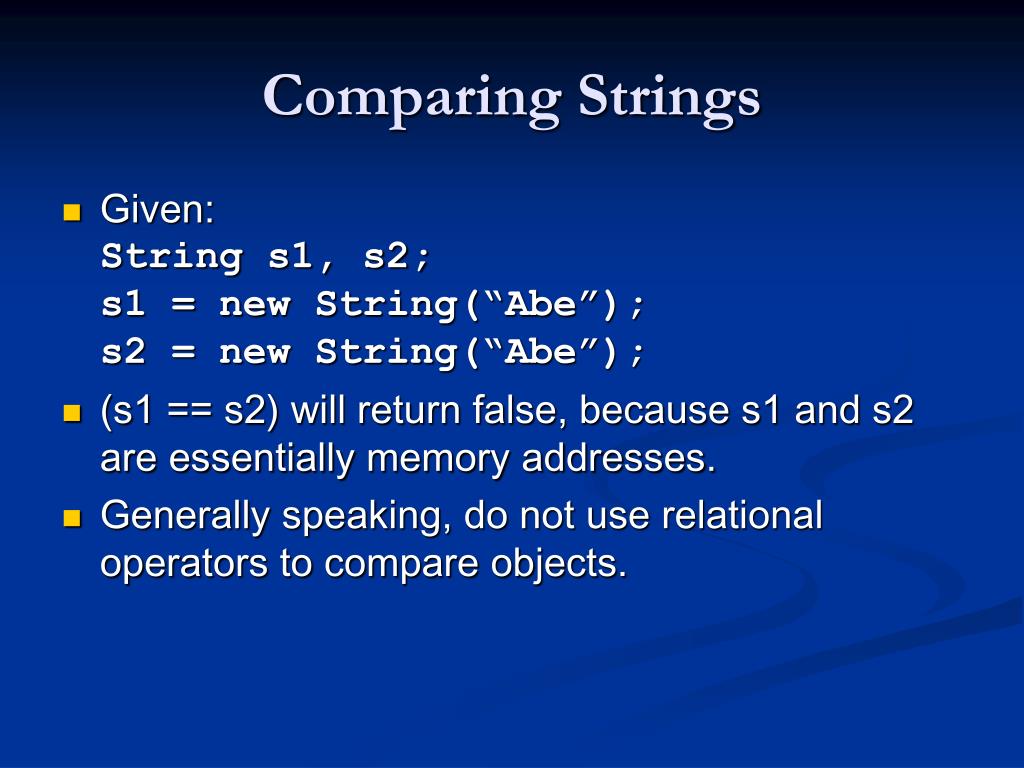 Comparing Strings • Given:String s1, s2;s1 = new String(“Abe”);s2 = new String(“Abe”); • (s1 == s2) will return false, because s1 and s2 are essentially memory addresses. • Generally speaking, do not use relational operators to compare objects.