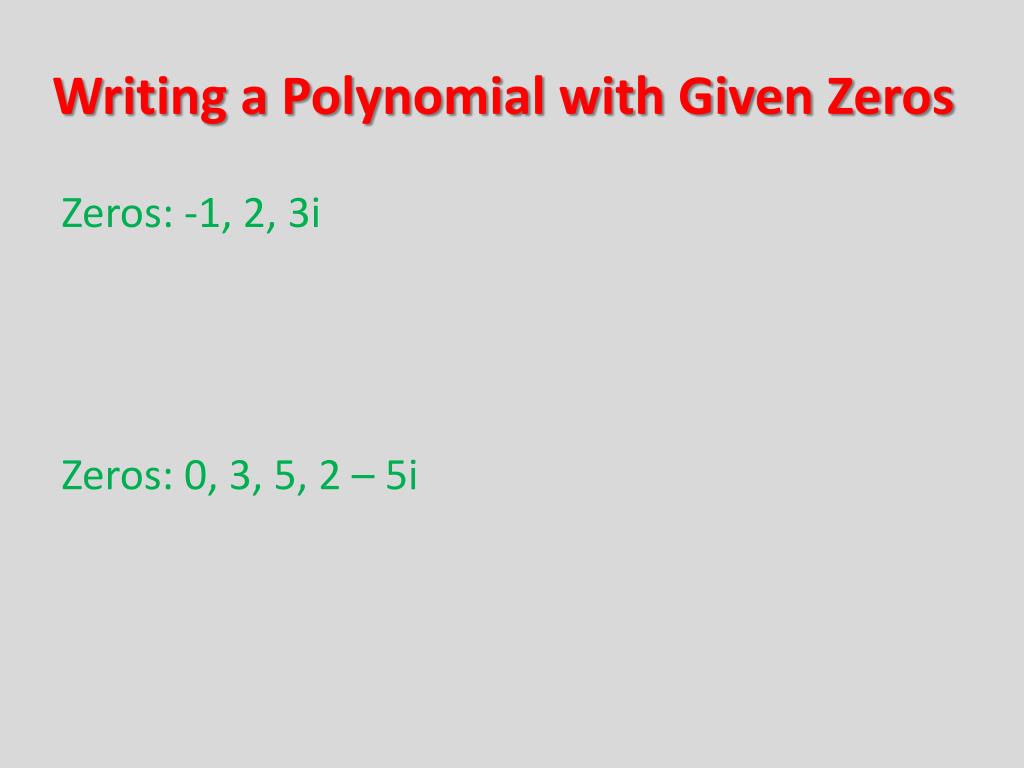 Writing a Polynomial with Given Zeros Zeros: -1, 2, 3i Zeros: 0, 3, 5, 2 – 5i