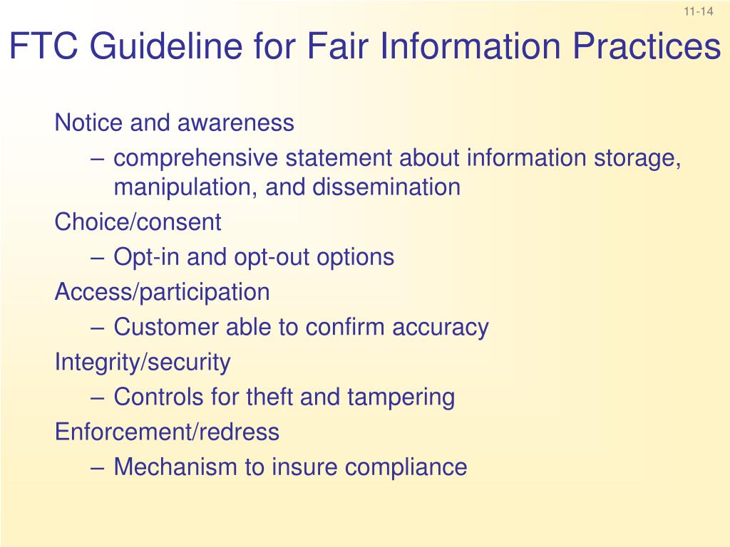 FTC Guideline for Fair Information Practices Notice and awareness • comprehensive statement about information storage, manipulation, and dissemination Choice/consent • Opt-in and opt-out options Access/participation • Customer able to confirm accuracy Integrity/security • Controls for theft and tampering Enforcement/redress • Mechanism to insure compliance
