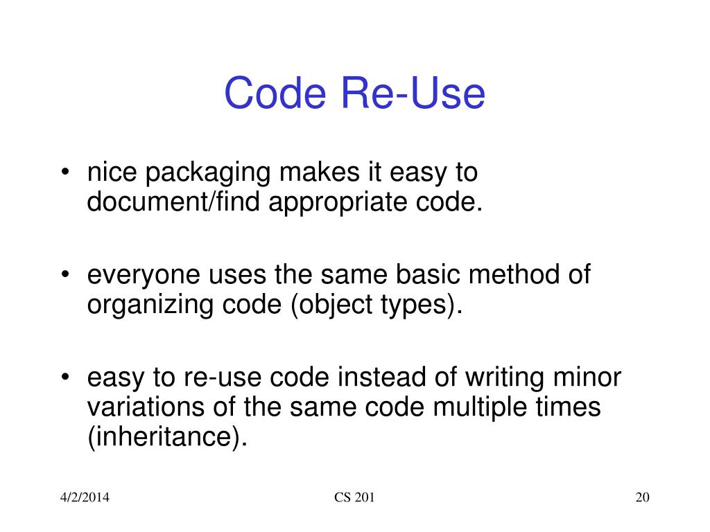 Code Re-Use • nice packaging makes it easy to document/find appropriate code. • everyone uses the same basic method of organizing code (object types). • easy to re-use code instead of writing minor variations of the same code multiple times (inheritance). CS 201