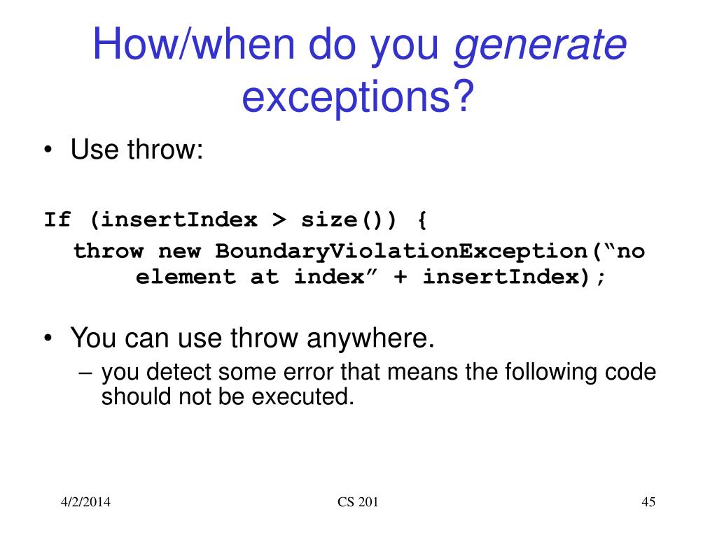 How/when do you generate exceptions? • Use throw: If (insertIndex > size()) { throw new BoundaryViolationException(“no element at index” + insertIndex); • You can use throw anywhere. • you detect some error that means the following code should not be executed. CS 201