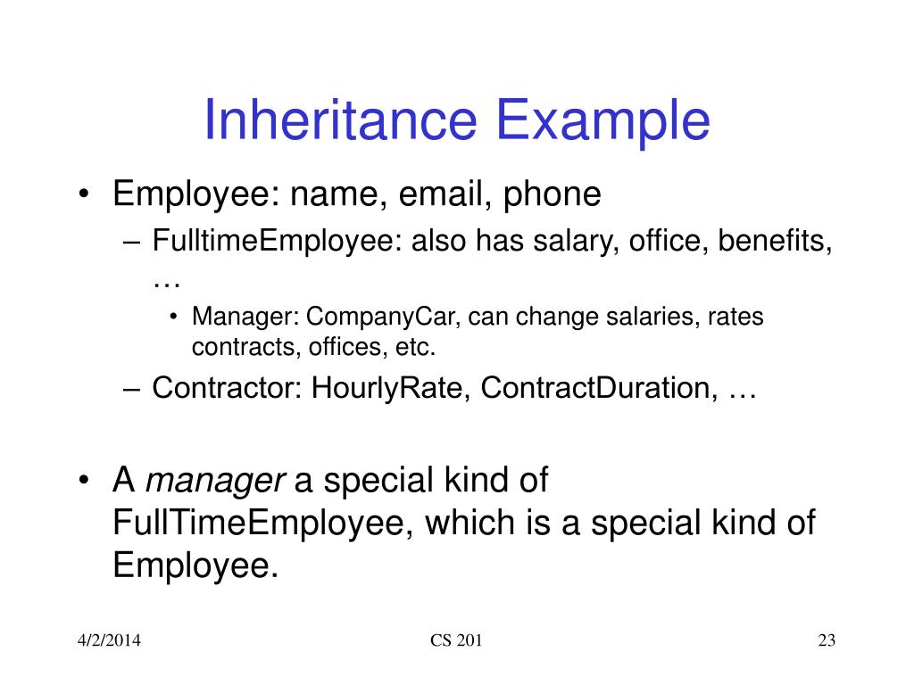 Inheritance Example • Employee: name, email, phone • FulltimeEmployee: also has salary, office, benefits, … • Manager: CompanyCar, can change salaries, rates contracts, offices, etc. • Contractor: HourlyRate, ContractDuration, … • A manager a special kind of FullTimeEmployee, which is a special kind of Employee. CS 201