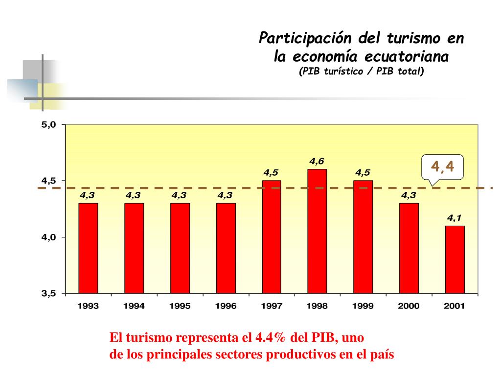 Participación del turismo en la economía ecuatoriana (PIB turístico / PIB total) 4,4 El turismo representa el 4.4% del PIB, uno de los principales sectores productivos en el país