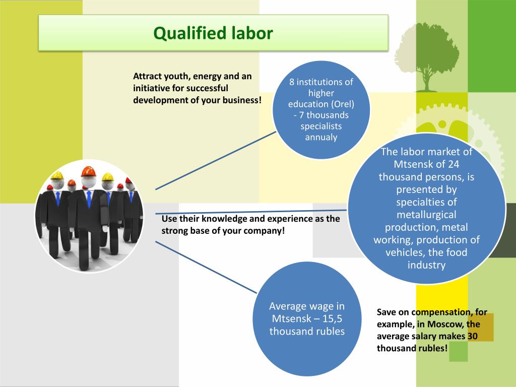 Qualified labor Attract youth, energy and an initiative for successful development of your business! Use their knowledge and experience as the strong base of your company! Save on compensation, for example, in Moscow, the average salary makes 30 thousand rubles!