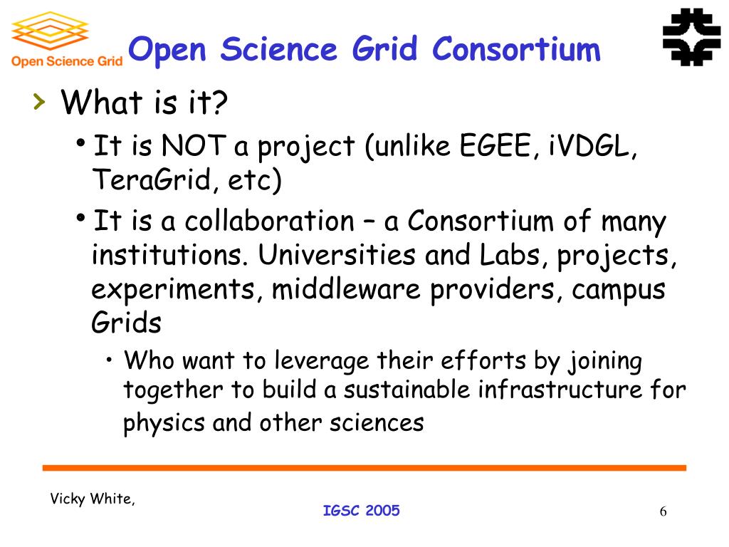 Open Science Grid Consortium • What is it? • It is NOT a project (unlike EGEE, iVDGL, TeraGrid, etc) • It is a collaboration – a Consortium of many institutions. Universities and Labs, projects, experiments, middleware providers, campus Grids • Who want to leverage their efforts by joining together to build a sustainable infrastructure for physics and other sciences Vicky White,