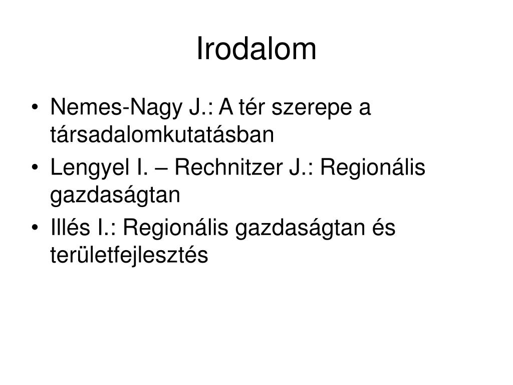 Irodalom • Nemes-Nagy J.: A tér szerepe a társadalomkutatásban • Lengyel I. – Rechnitzer J.: Regionális gazdaságtan • Illés I.: Regionális gazdaságtan és területfejlesztés