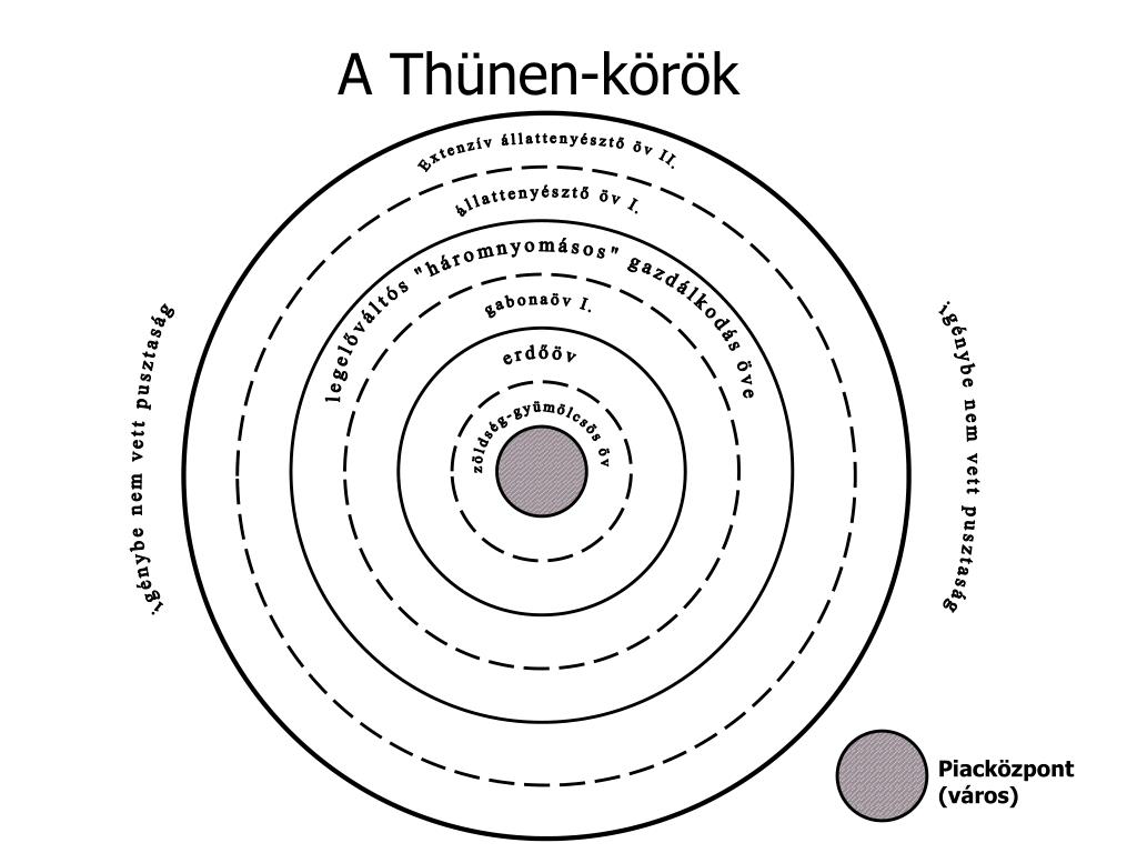 AThünen-körök Extenzív állattenyésztő öv II. állattenyésztő öv I. legelőváltós "háromnyomásos" gazdálkodás öve gabonaöv I. erdőöv zöldség-gyümölcsös öv igénybe nem vett pusztaság igénybe nem vett pusztaság Piacközpont(város)