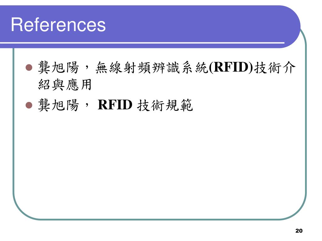 References • 龔旭陽,無線射頻辨識系統(RFID)技術介紹與應用 • 龔旭陽,RFID 技術規範