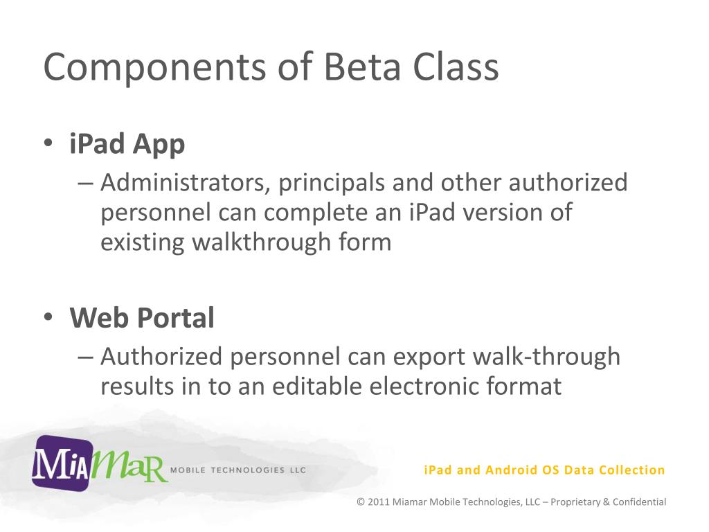 Components of Beta Class • iPad App • Administrators, principals and other authorized personnel can complete an iPad version of existing walkthrough form • Web Portal • Authorized personnel can export walk-through results in to an editable electronic format