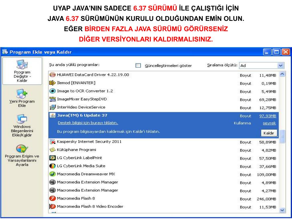 UYAP JAVA'NIN SADECE 6.37 SÜRÜMÜ İLE ÇALIŞTIĞI İÇİN JAVA 6.37 SÜRÜMÜNÜN KURULU OLDUĞUNDAN EMİN OLUN. EĞER BİRDEN FAZLA JAVA SÜRÜMÜ GÖRÜRSENİZ DİĞER VERSİYONLARI KALDIRMALISINIZ.