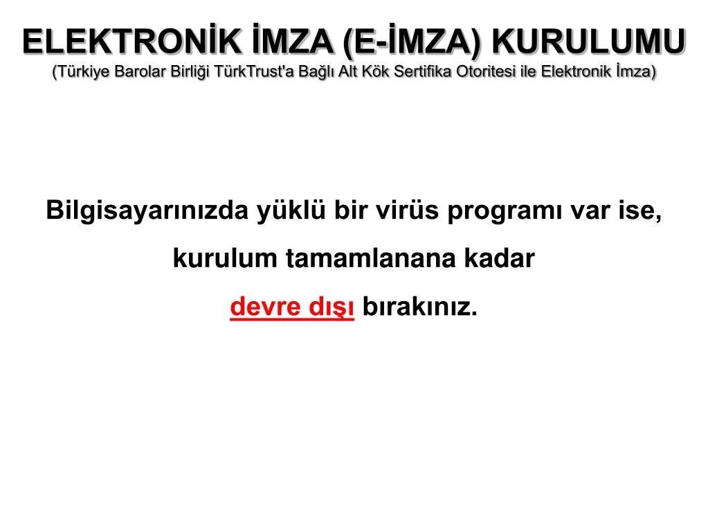 ELEKTRONİK İMZA (E-İMZA) KURULUMU (Türkiye Barolar Birliği TürkTrust'a Bağlı Alt Kök Sertifika Otoritesi ile Elektronik İmza) Bilgisayarınızda yüklü bir virüs programı var ise, kurulum tamamlanana kadar devre dışı bırakınız.