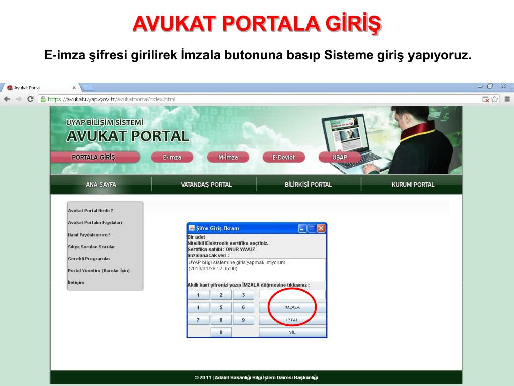 AVUKAT PORTALA GİRİŞ E-imza şifresi girilirek İmzala butonuna basıp Sisteme giriş yapıyoruz.