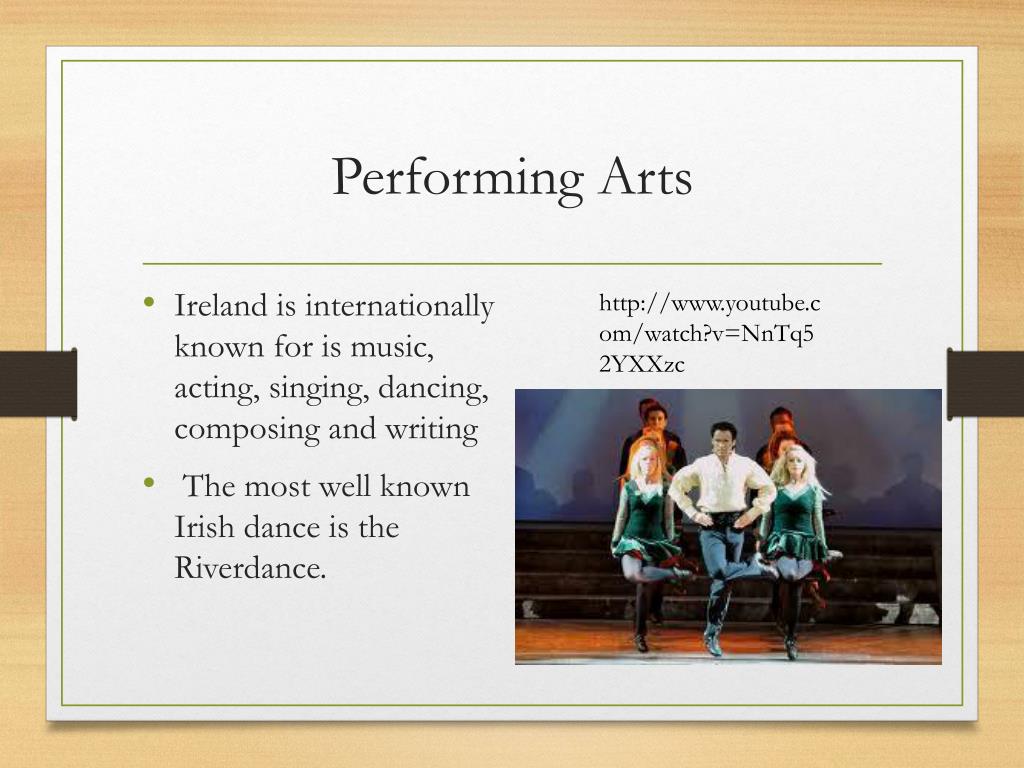 Performing Arts • Ireland is internationally known for is music, acting, singing, dancing, composing and writing • The most well known Irish dance is the Riverdance. http://www.youtube.com/watch?v=NnTq52YXXzc