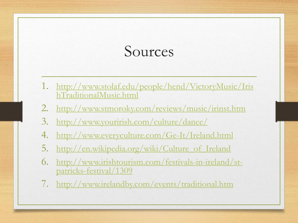 Sources • http://www.stolaf.edu/people/hend/VictoryMusic/IrishTraditionalMusic.html • http://www.stmoroky.com/reviews/music/irinst.htm • http://www.yourirish.com/culture/dance/ • http://www.everyculture.com/Ge-It/Ireland.html • http://en.wikipedia.org/wiki/Culture_of_Ireland • http://www.irishtourism.com/festivals-in-ireland/st-patricks-festival/1309 • http://www.irelandby.com/events/traditional.htm