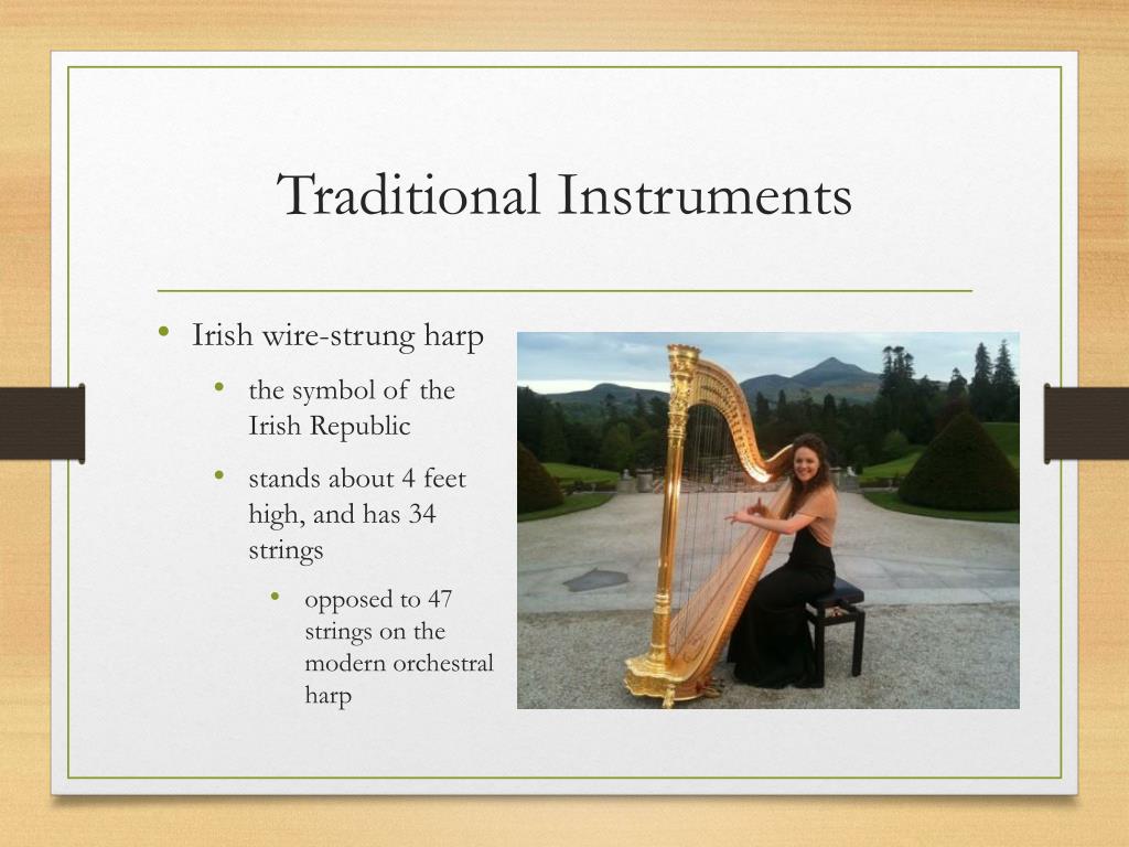 Traditional Instruments • Irish wire-strung harp • the symbol of the Irish Republic • stands about 4 feet high, and has 34 strings • opposed to 47 strings on the modern orchestral harp