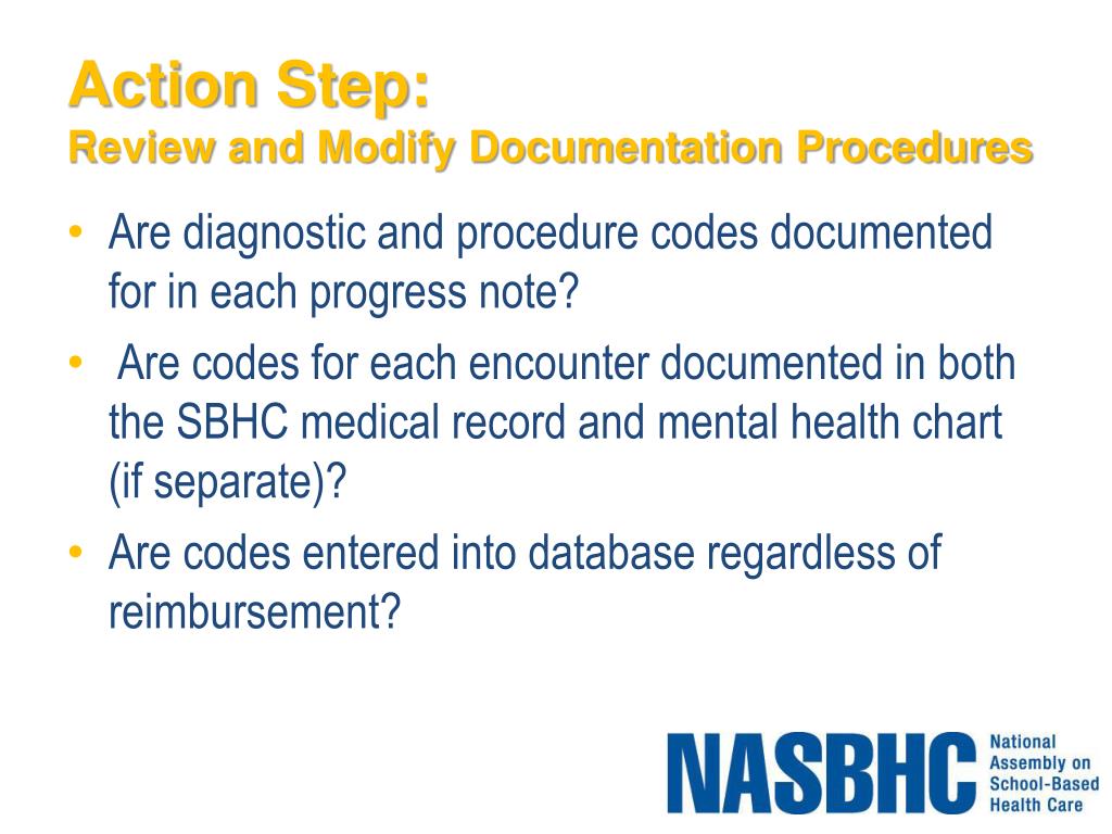 Action Step:Review and Modify Documentation Procedures • Are diagnostic and procedure codes documented for in each progress note? • Are codes for each encounter documented in both the SBHC medical record and mental health chart (if separate)? • Are codes entered into database regardless of reimbursement?