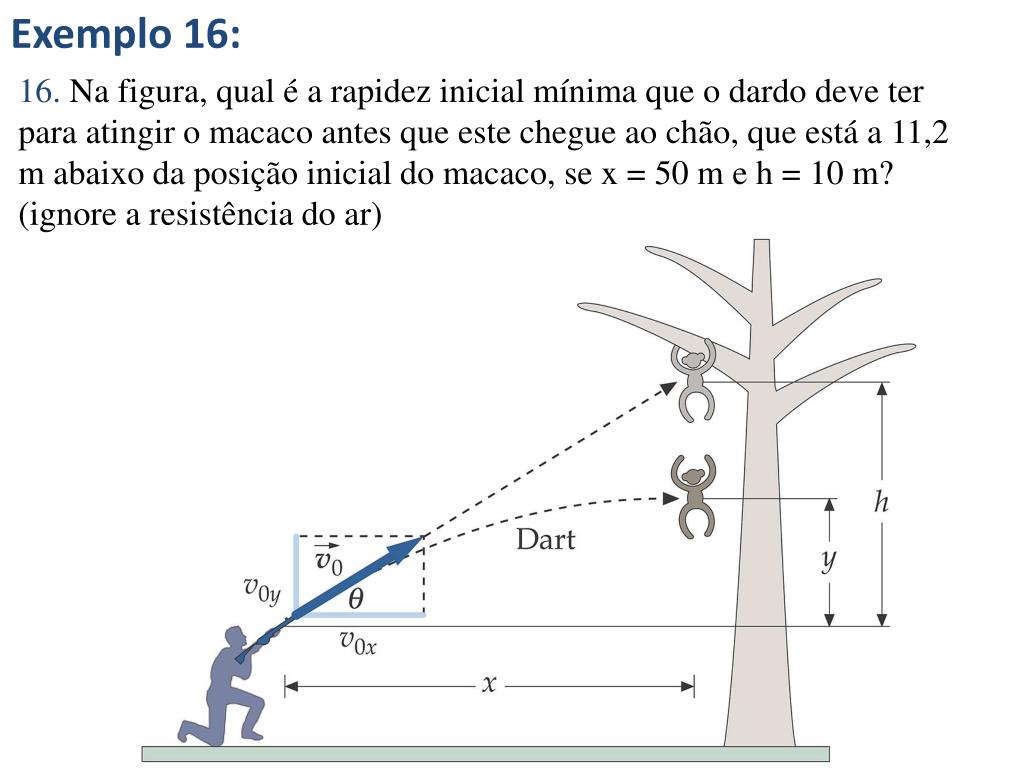 Exemplo 16: 16. Na figura, qual é a rapidez inicial mínima que o dardo deve ter para atingir o macaco antes que este chegue ao chão, que está a 11,2 m abaixo da posição inicial do macaco, se x = 50 m e h = 10 m? (ignore a resistência do ar)